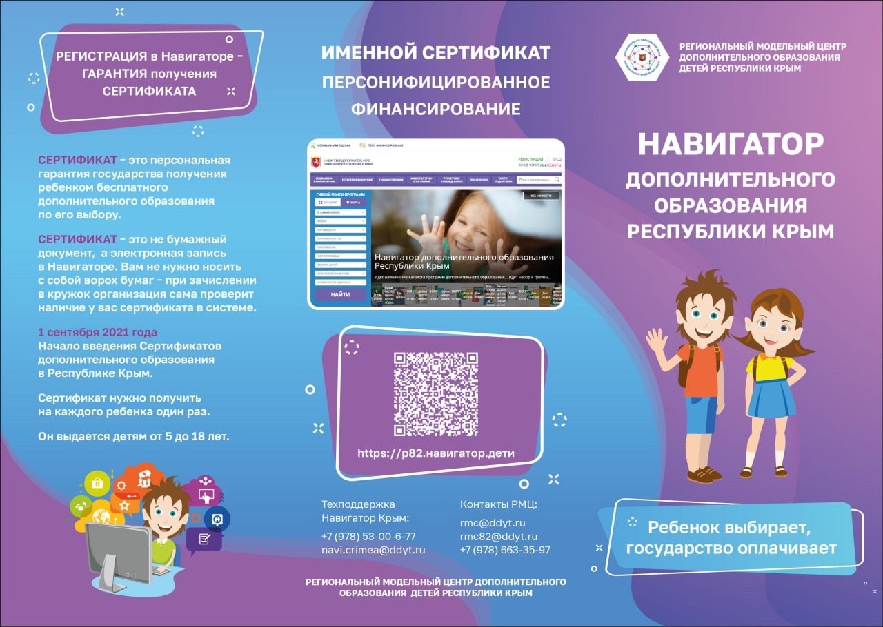Автоматизированная информационная система "Навигатор дополнительного образования Республики Крым" (далее – Навигатор) – это информационный ресурс, на котором размещена информация о программах дополнительного образования и реализующих их организациях https://р82.навигатор.дети/