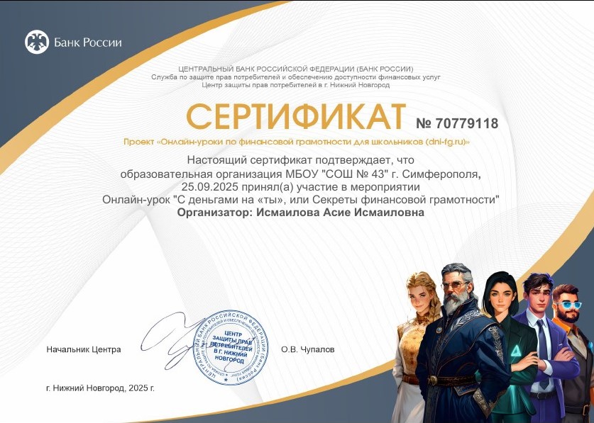 В апреле 2025 г. для обучающихся 8-10 классов МБОУ «СОШ № 43» г. Симферополя Исмаиловой Асие Исмаиловной, учителем истории и обществознания, ответственным за реализацию мероприятий по формированию финансовой грамотности, проведён Всероссийский тематический урок на тему «НЕдетские игры 2.0: Дроп поневоле» в соответствии с методическими рекомендациями ФГАОУ ВО «Российский университет дружбы народов имени Патриса Лумумбы».